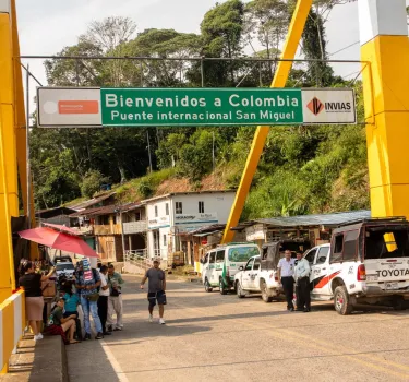 Un pequeño caserío, algunos puestos de comida y varias camionetas de transporte público anuncian la llegada al puente internacional, a 25 minutos de La Dorada. Hay una oficina de Migración y una estación de Policía, pero las demás instituciones están del lado ecuatoriano, en el Centro Binacional Fronterizo (Cebaf). En las noches, cuando cierra la frontera, la calle que lleva al puente se convierte en una cancha de fútbol para los niños del caserío, mientras por los lotes cercanos cruzan carros y motos.