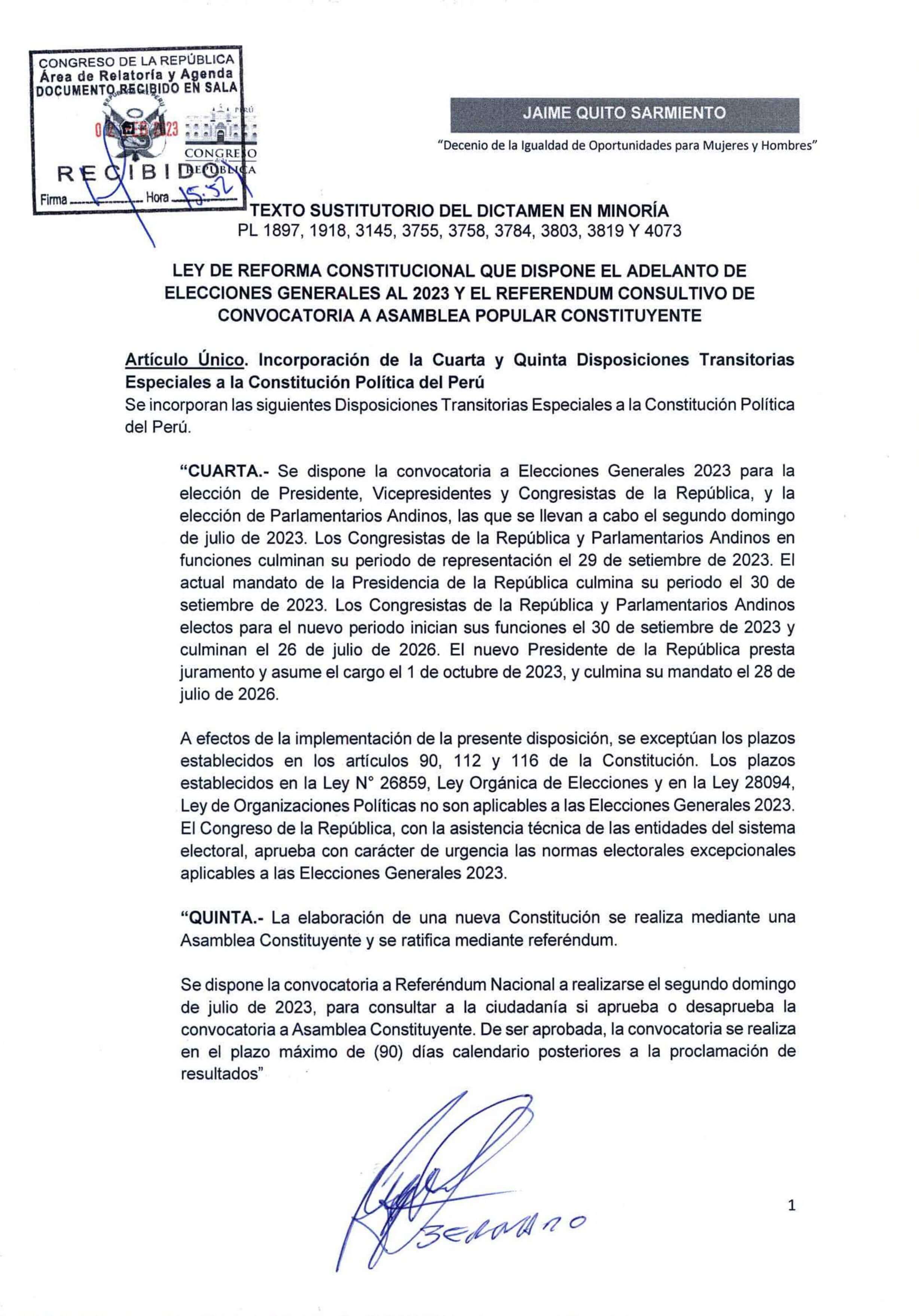 El congresista Bernardo Quito Sarmiento, de la bancada de Perú Libre, presentó un texto sustitutorio para el adelanto de elecciones generales. El mismo propone que los comicios se celebren el segundo domingo de julio de 2023 e incluyan un referéndum consultivo sobre una asamblea constituyente.